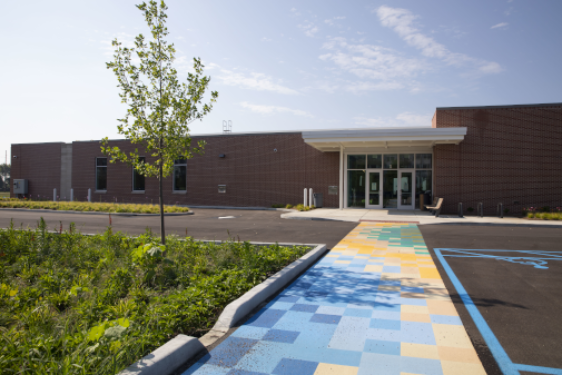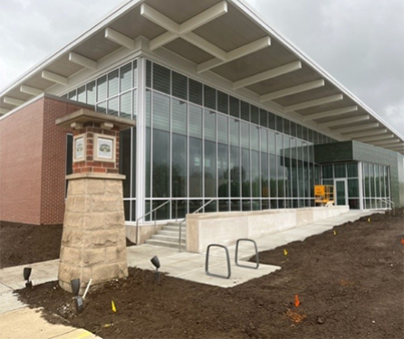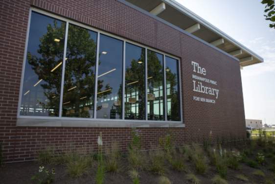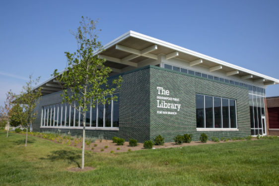 The 22,000 square foot Fort Ben Branch provides easy access to Library services and collections due to its location in a high-traffic community with access to public transportation. It includes community meeting spaces and study rooms, beautiful landscaping components, and walk-up, bike-up, and drive-up material return locations. Its roof-top solar photovoltaic system will provides 80% of the building's electricity needs. The Library was envisioned as part of a redevelopment plan since the land was decommissioned and transitioned from the U.S. military to the City of Indianapolis in the 1990s. Take a 3D tour of the Fort Ben Branch.