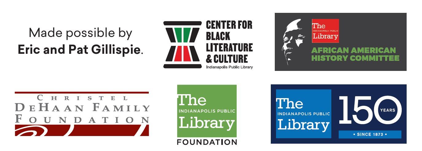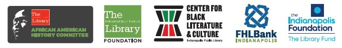 The Indianapolis Public Library African American History Committee logo, The Indianapolis Public Library Foundation logo, the Center for Black Literature & Culture logo, the Federal Home Loan Bank logo, and the Indianapolis Foundation Library Fund logo.