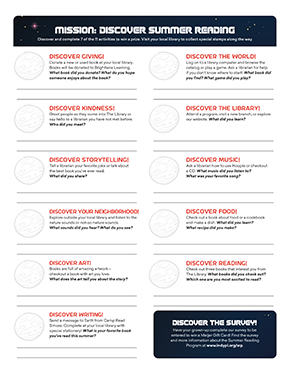 5. Earn an extra Prize Ready to dig deeper? Complete 7 of 11 activity challenges to win a bonus prize. Dowload and print the Kids Activity Challenges (.pdf) or pick one up at any Library location.