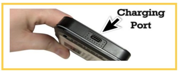 The Micro-USB charger lent with the device connects to the charging port on the bottom of the device.